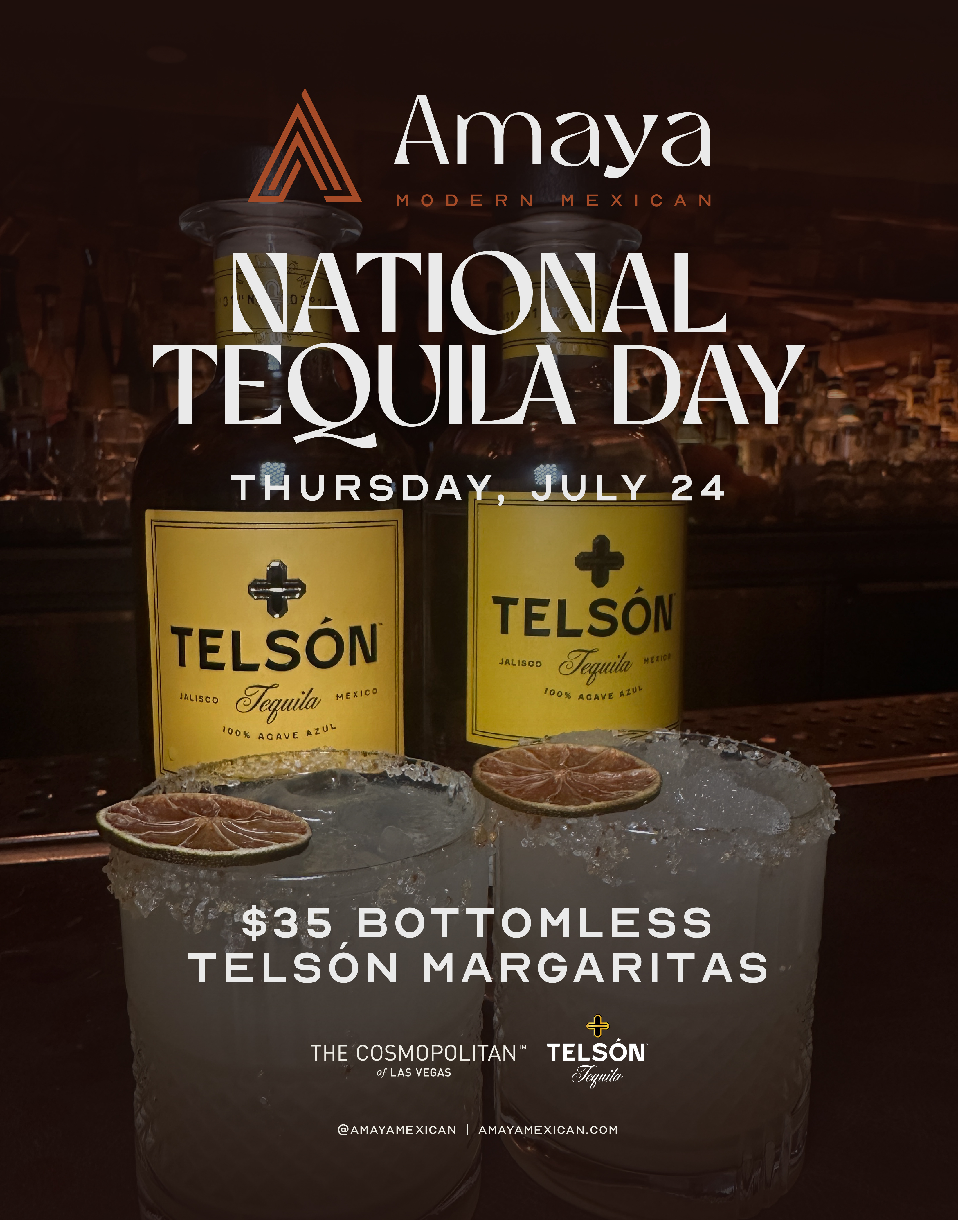 Located inside The Cosmopolitan, Amaya Modern Mexican is not only the go-to Las Vegas Strip restaurant for bold flavors and vibrant energy—it’s also your destination for an unforgettable margarita experience. This year, we’re honoring the star of the agave world with $35 bottomless margaritas, all made exclusively with Telson Tequila.